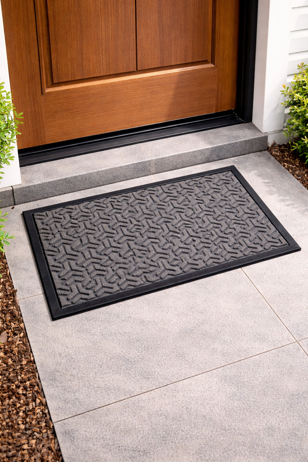 Πατάκι εισόδου ορθογώνιο ανάγλυφο με μοντέρνο σχέδιο. Η επάνω επιφάνεια μοκέτα κατασκευασμένη από 100% πολυπροπυλένιο και η κάτω είναι 100% καουτσούκ για αντιολισθητικότητα και ανθεκτικότητα. Είναι ιδανικό για χρήση στην είσοδο του σπιτιού ή σε κάποια μπαλκονόπορτα.